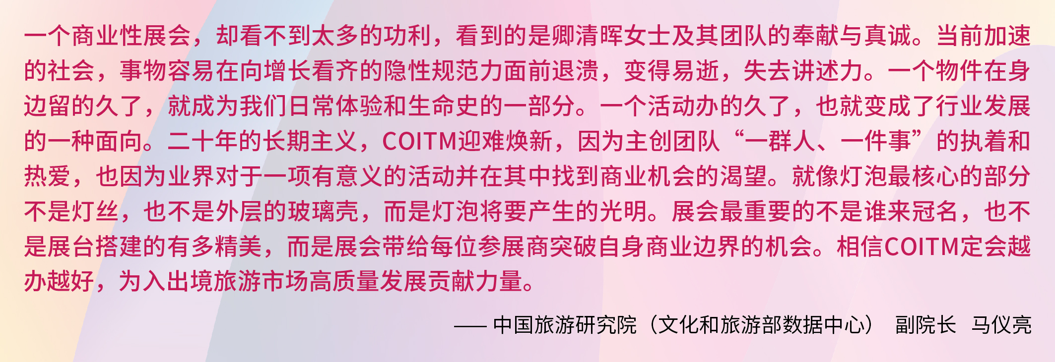 COITM自筹备以来,已收到海内外众多旅游目的地政府机构与无数中国旅游业者的鼎力支持、参与和祝福!中国旅游研究院(文化和旅游部数据中心)马副院长在给COITM的寄语中期待“展会带给每位参展商突破自身商业边界的机会“。