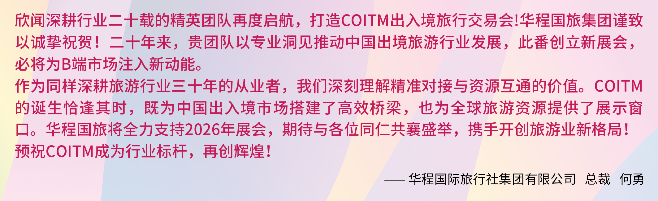 同样,中国出境旅游行业的另一龙头企业,华程国际旅行社集团有限公司总裁何勇也表达了诚挚的祝福与殷切期待,他希望“COITM推动中国出境旅游行业发展,为B端市场注入新动能!”