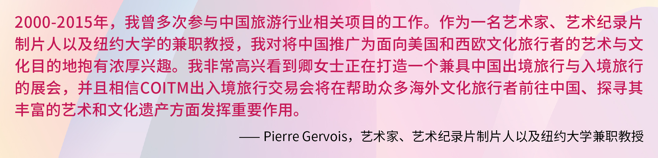 而身处美国的法国艺术家、艺术纪录片制片人以及纽约大学兼职教授Pierre Gervois对2026COITM出入境旅行交易会的筹备非常兴奋地表示“他积极支持COITM,并认为COITM将帮助众多海外文化旅行者前往中国、探寻丰富的艺术和文化遗产方面发挥重要作用。”