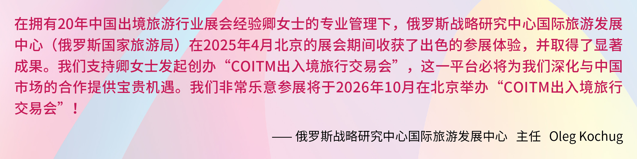 此外,俄罗斯战略研究中心国际旅游发展中心(俄罗斯国家旅游局)、突尼斯旅游局、白俄罗斯旅游局等也对2026 COITM的举办表达了强烈支持和参与愿望,彰显出国际社会对中国旅游市场的高度信心!